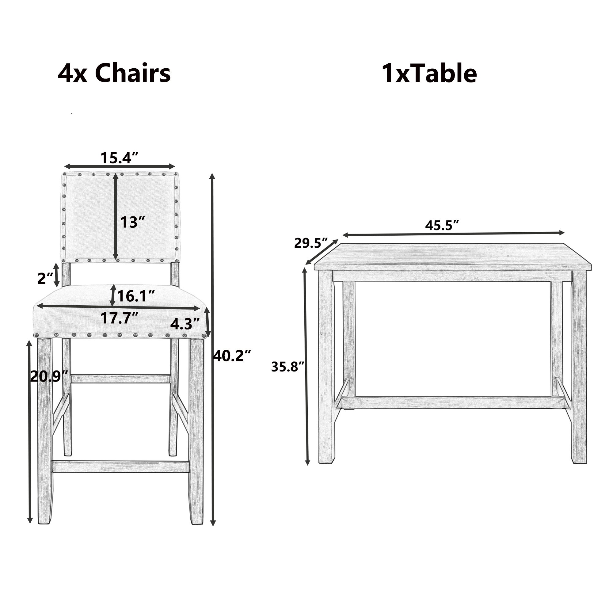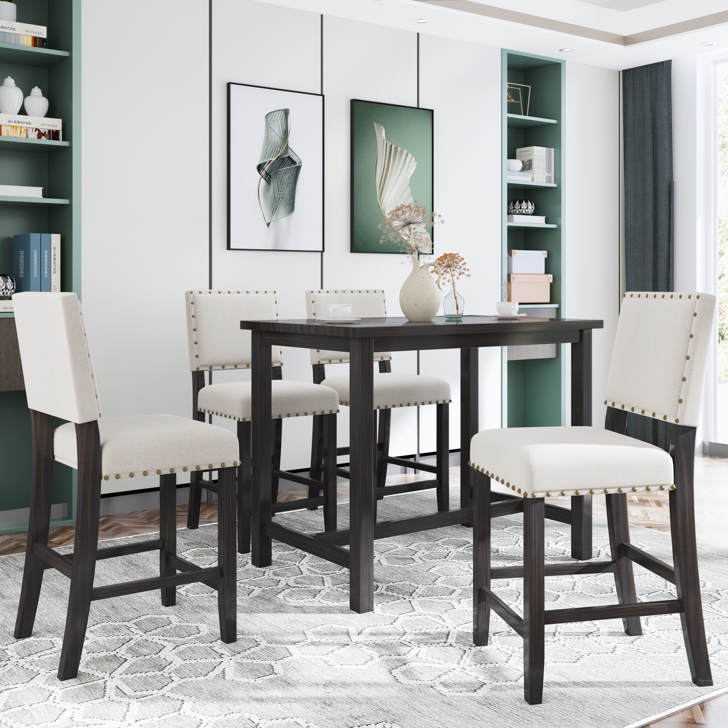 5 Piece Rustic Wooden Counter Height Dining Table Set with 4 Upholstered Chairs for Small Places; Espresso+ Beige