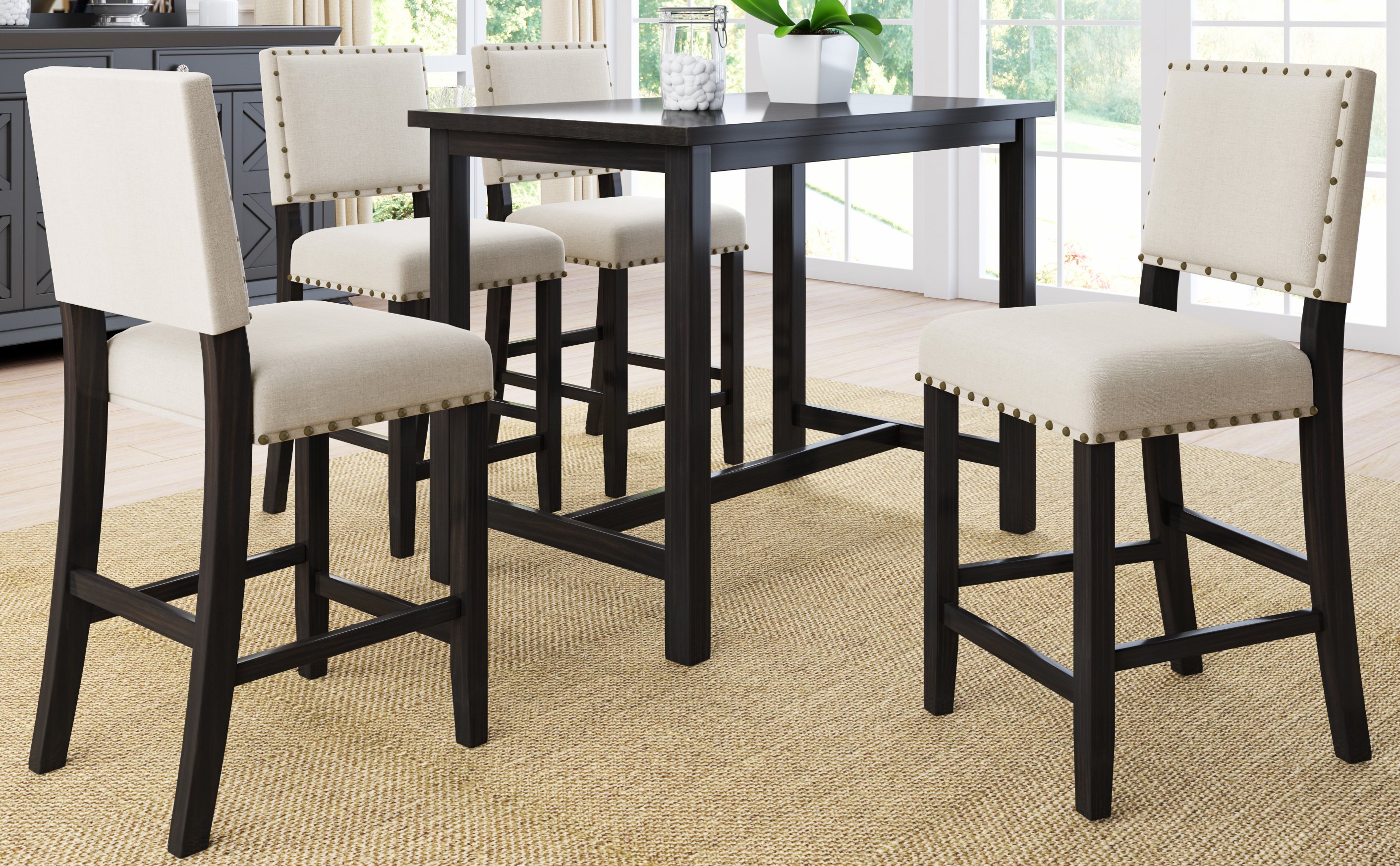 Home > 5 Piece Rustic Wooden Counter Height Dining Table Set with 4 Upholstered Chairs for Small Places; Espresso+ Beige