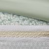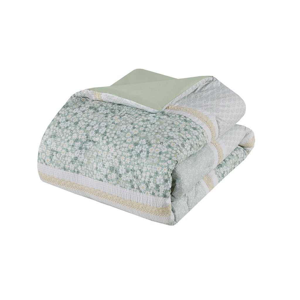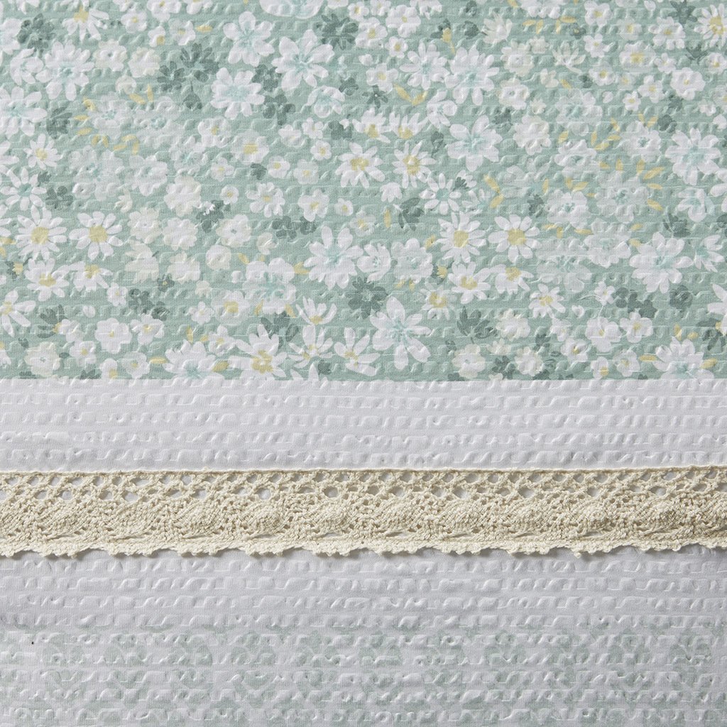DescriptionFeaturing three different floral and botanical print designs separated by lace trims, this seersucker microfiber comforter set exudes shabby chic/farmhouse style that adds a touch of elegance to any bedroom. The two decorative pillows feature gathered fabric and embroidery with lace trim and ruffles, adding to the overall charm of the set. Colors featured in this set include various shade of greens, yellows, and whites. The comforter and pillows are filled with hypoallergenic polyester filling that is treated to be dustproof, ensuring a restful and comfortable sleeping experience. This machine washable bedding set features an antimicrobial treatment, which inhibits bacteria growth and keeps the bedding fresher for longer.Product DetailsFull/Queen1 Comforter:90"W x 90"L2 Standard Shams:20"W x 26"L (2)1 Throw Pillow:12"W x 18"L1 Throw Pillow:18"W x 18"LMaterialComforter/Sham: Seersucker microfiber with lace, printed, solid microfiber, 100% polyester reverseFill: 100% polyesterPillow: 100% polyester