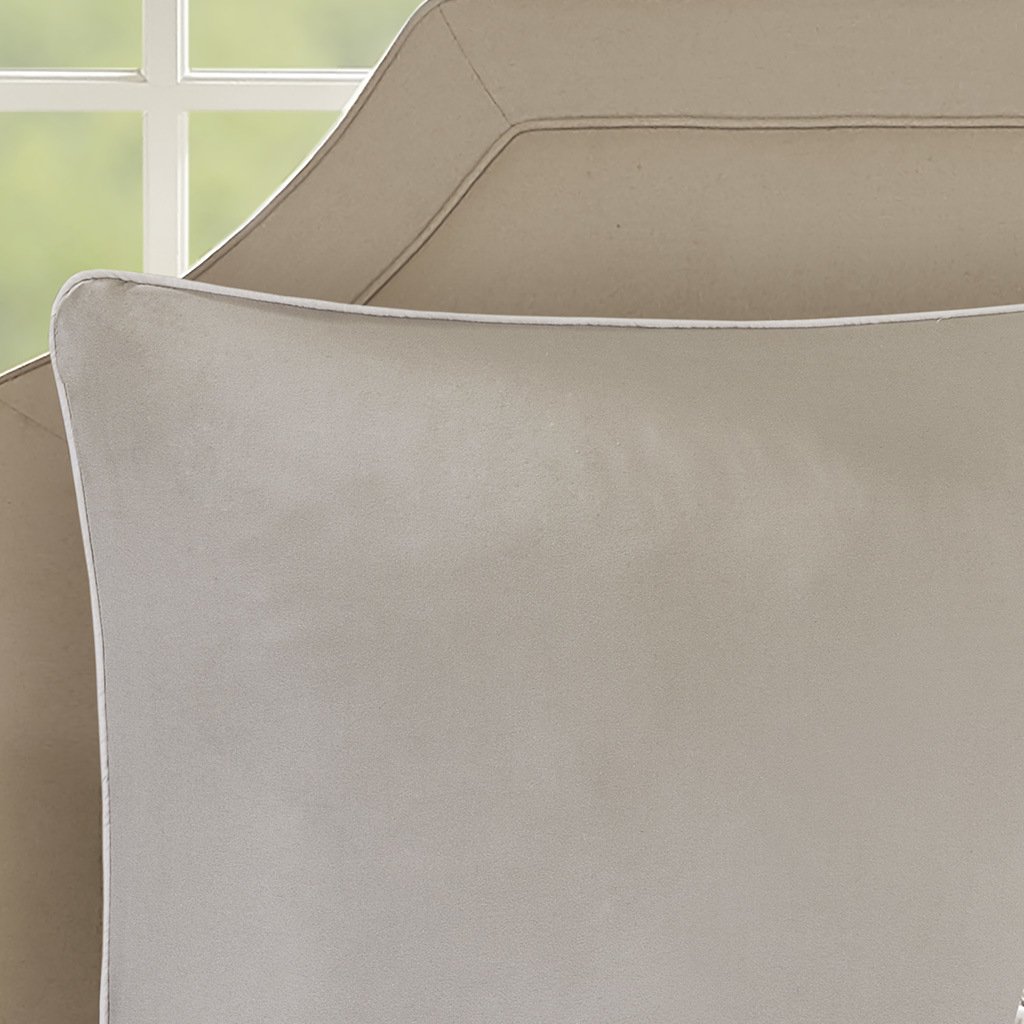 DescriptionThe 510 Design Ramsey Embroidered 8 Piece Comforter Set introduces a graceful elegance to your bedroom decor. A pieced embroidery design with quilting and pintuck details, in neutral hues, adorns the face of the comforter and shams, for a beautiful transitional look. Solid Euro shams complement the top of the bed, while two embroidered decorative pillows and a solid bed skirt provide the perfect finishing touches to the bedding set. Made from ultra-soft microfiber, this pieced comforter set is machine washable and may come in rolled or compressed packing and will need to be fluffed up. Use a steam iron to help remove wrinkles easier.Product DetailsCal King1 Comforter:104"W x 92"L2 King Shams:20"W x 36"L (2)1 Bedskirt:72"W x 84"L + 15"D2 Euro Shams:26"W x 26"L (2)1 Decorative Pillow:12"W x 18"L1 Decorative Pillow:18"W x 18"LMaterialSoft microfiber face and reverse comforter, printed pieced with quilting, 6 oz/sq yard polyester filling; microfiber bed skirt , pillows and euro shams