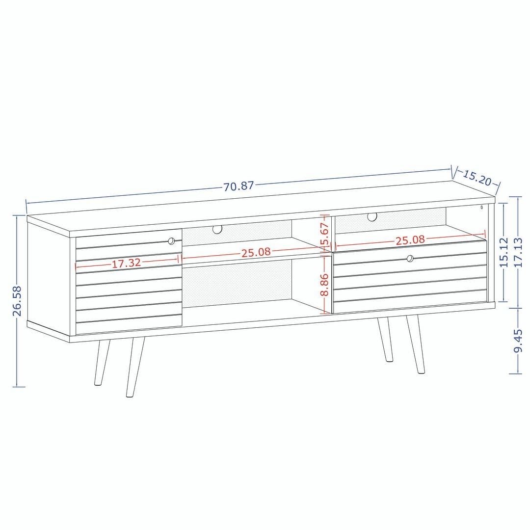 The Liberty 70.86 Mid-Century Modern TV Stand is mid-century modern at its best. Quality craftsmanship and careful detailing create the ultimate blend of style; functionality; and brilliant design. A sophisticated entertainment center; the piece features open shelving; as well as two hidden compartments perfect for stashing DVDs; board games; electronics; and media accessories. Free standing and easily moved; this stand will mix well with any decor and its artful grooves will create a statement in any space. Available in white; white and rustic brown; white and aqua blue; white and yellow; rustic brown; rustic brown and white; and rustic brown and yellow. Free Standing TV Stand for Living Room and Bedroom use. Upon Assembly; Measures: 70.86 in. Length; 26.57 in. Height; 15.19in. Depth.Recommended for a 50" -65" TV. Includes 2 Media Holes for Wire Management.Fashionable Splayed Legs made from Solid Wood for Extra Durability. Includes 3 Open Shelves; 1 Concealed Large Cubby; and 1 Drawer.90° Open Door Style with Ring Handles and Sleek Line Indent Design. Home Assembly Required. All Hardware Included.
