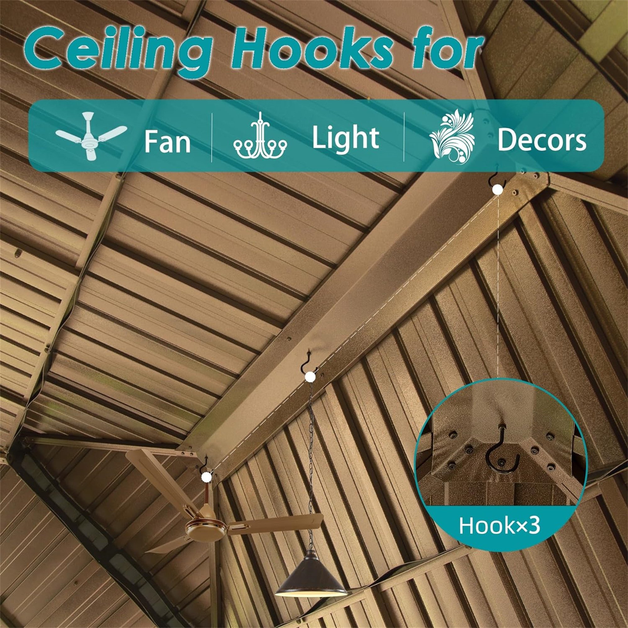 Effortless Ambiance with Strong Hooks - Enhance your hardtop gazebo's versatility with 3 robust hooks! Each hook effortlessly holds up to 20 lbs, allowing you to hang lights, fans, or decorations effortlessly. Create your perfect outdoor atmosphere with ease.